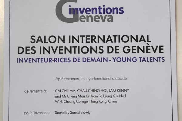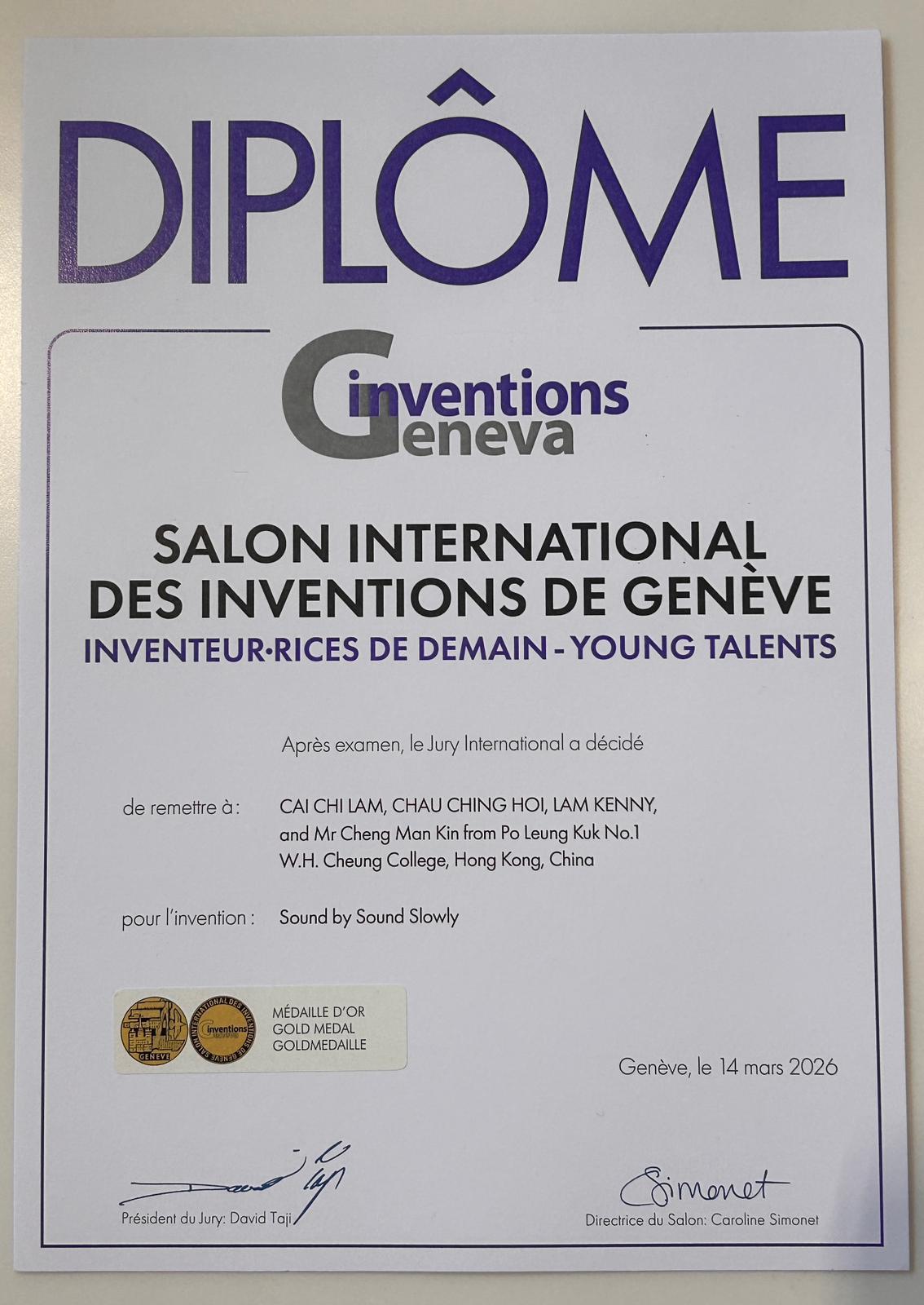 香港學生在國際創科舞台再添佳績。來自屬校保良局第一張永慶中學的學生蔡智林、周靖凱、林浩然,在鄭文健老師指導下,參加於瑞士現正舉行的 「第51屆日內瓦國際發明展(Geneva Inventions)」,其作品 《聲聲慢》(Sound by Sound Slowly) 獲得評審團肯定,榮獲金獎(Gold Medal)。