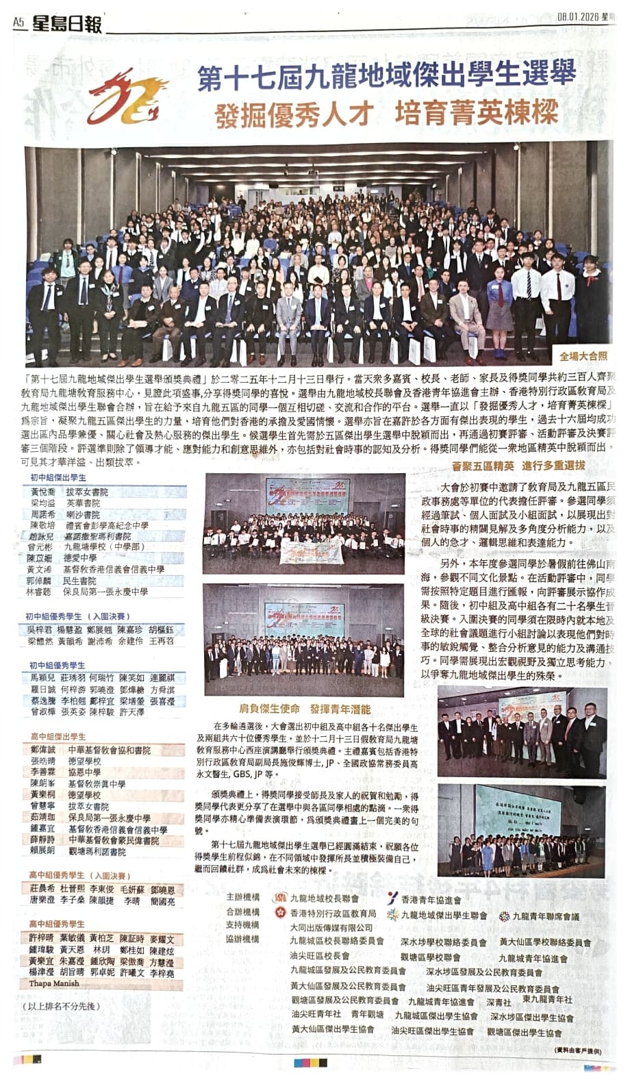 【星島日報】第十七屆九龍地域傑出學生選舉 發掘優秀人才 培育菁英棟樑