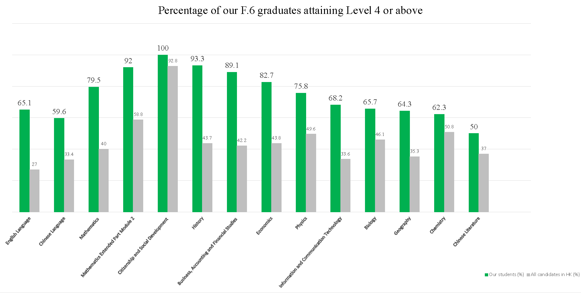 A total of 114 distinctions were awarded at the Levels 5** and 5*. The cumulative total of distinctions at Levels 5**, 5*, and 5 reached a monumental 272, reflecting widespread excellence throughout the cohort. 90.4% of our students reached ‘332A’ in the four core subjects (Chinese Language, English Language, Mathematics and Citizenship and Social Development), standing out from the average performance of all candidates in Hong Kong.